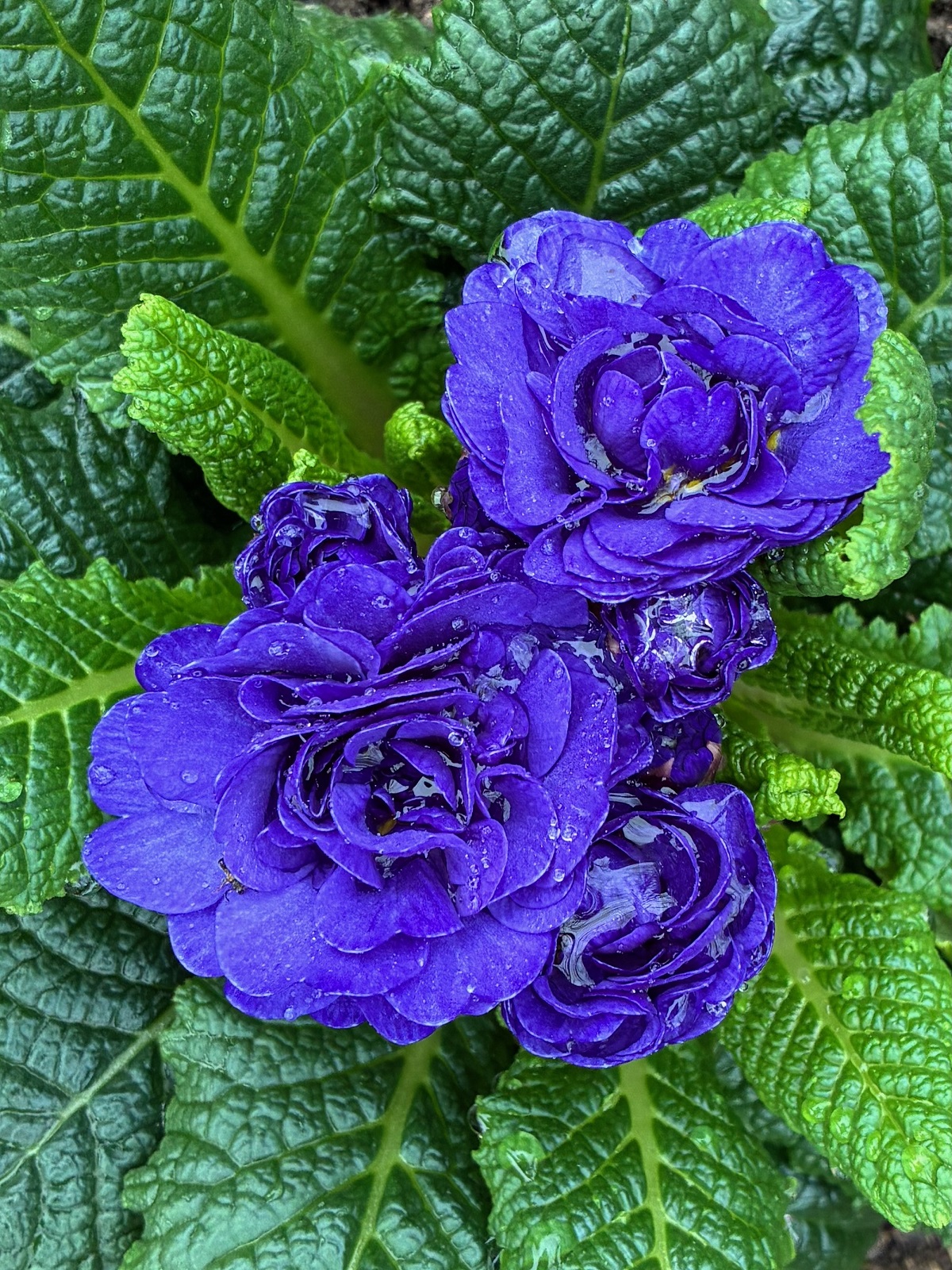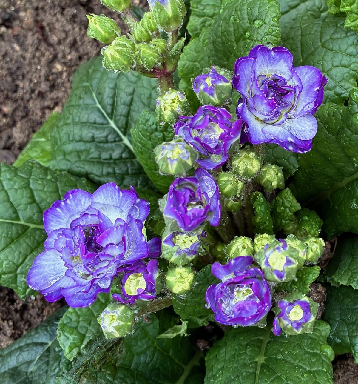 Un autre spécimen de la série de primevères acaules doubles jack-in-the-green, avec leur bleu violacé…