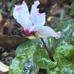 Les cyclamens ne ressemblent pas beaucoup aux primevères. Et pourtant, ces fleurs sont cousines, elles appartiennent toutes à la grande famille des primulacées. Celle-ci est l’une des plus fines, un cyclamen hederifolium, appelée communément cyclamen de Naples. Sa particularité est d’avoir du rose carmin, à la base de ses grands pétales blancs ondulés. Ses feuilles ont des motifs aléatoires et très graphiques. Comme beaucoup de leurs congénères, ces cyclamens très élégants fleurissent en automne.