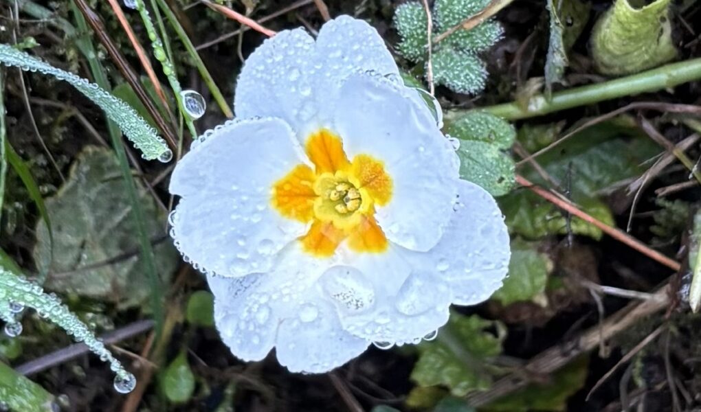 Une grande classique : la primevère de jardinerie acaule blanche. Un cultivar pas très différente de sa cousine, la primevère commune de la même couleur, mais avec des fleurs nettement plus larges.