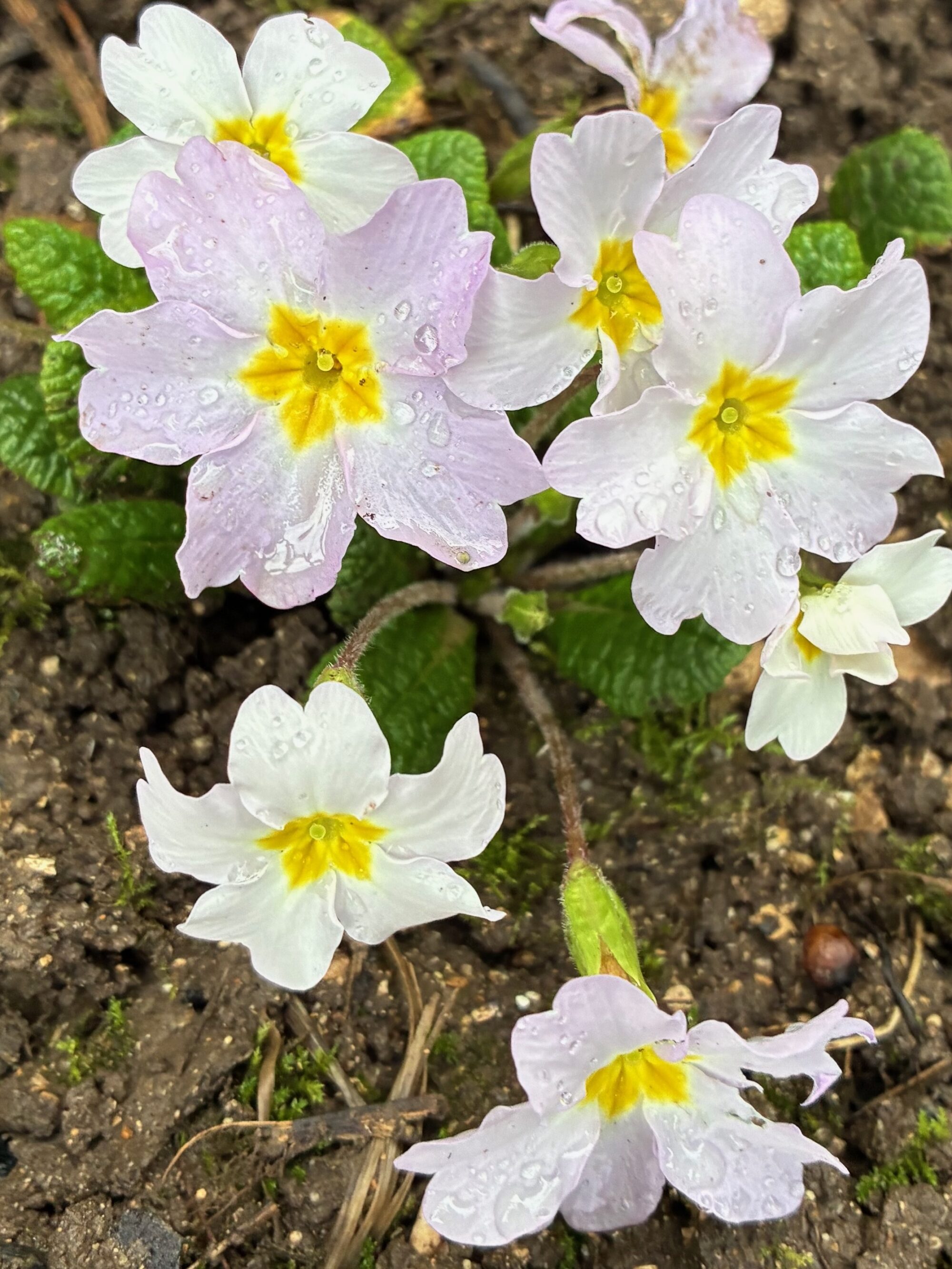 Une primevère commune blanchâtre, poussée au milieu de massifs colorés. Je la soupçonne de s’être croisée avec un cultivar, car sa couleur est très particulière, légèrement rosée. La photographie, malheureusement, ne restitue que très imparfaitement sa beauté.