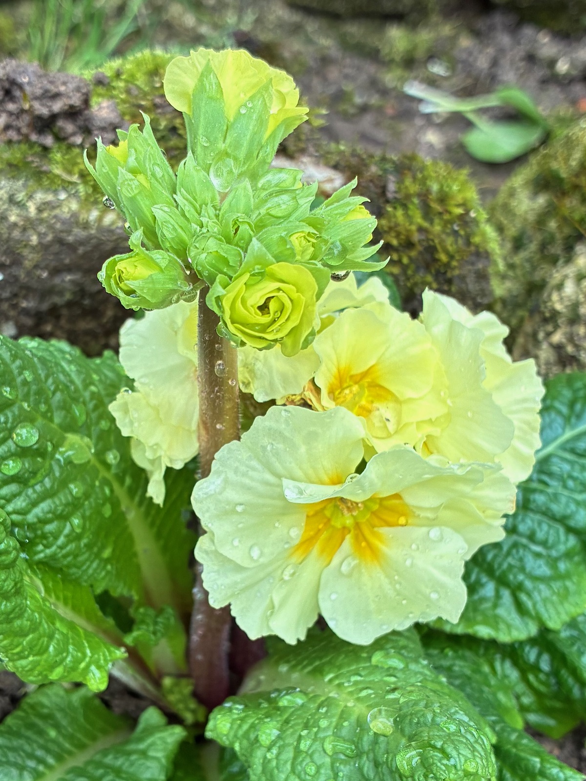 Une primevère polyanthus de nom inconnu, caractérisée par ses pétales légèrement ondulés, d’une couleur jeune crème, mise en valeur par un cœur jaune beaucoup plus vif.