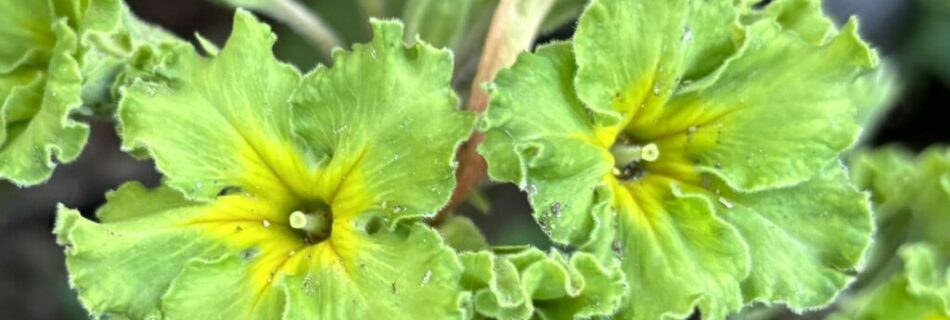 Les plus originales des primevères polyanthus, peut-être : des vertes frisotées, qui fleurissent à la fin du printemps. Pas spécialement jolies, mais franchement pas communes. Leur nom, Francisca, viendrait de la personne qui les a découvertes au Canada. Elles sont souvent vendues, à tort, sous le nom de Francesca.
